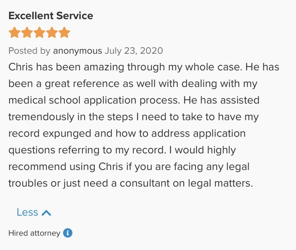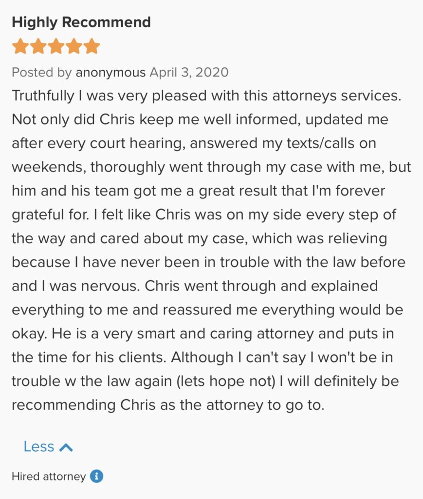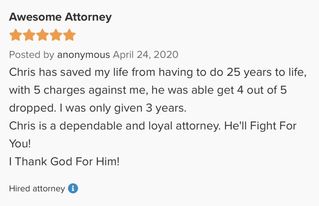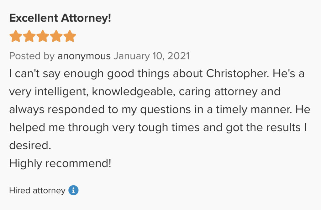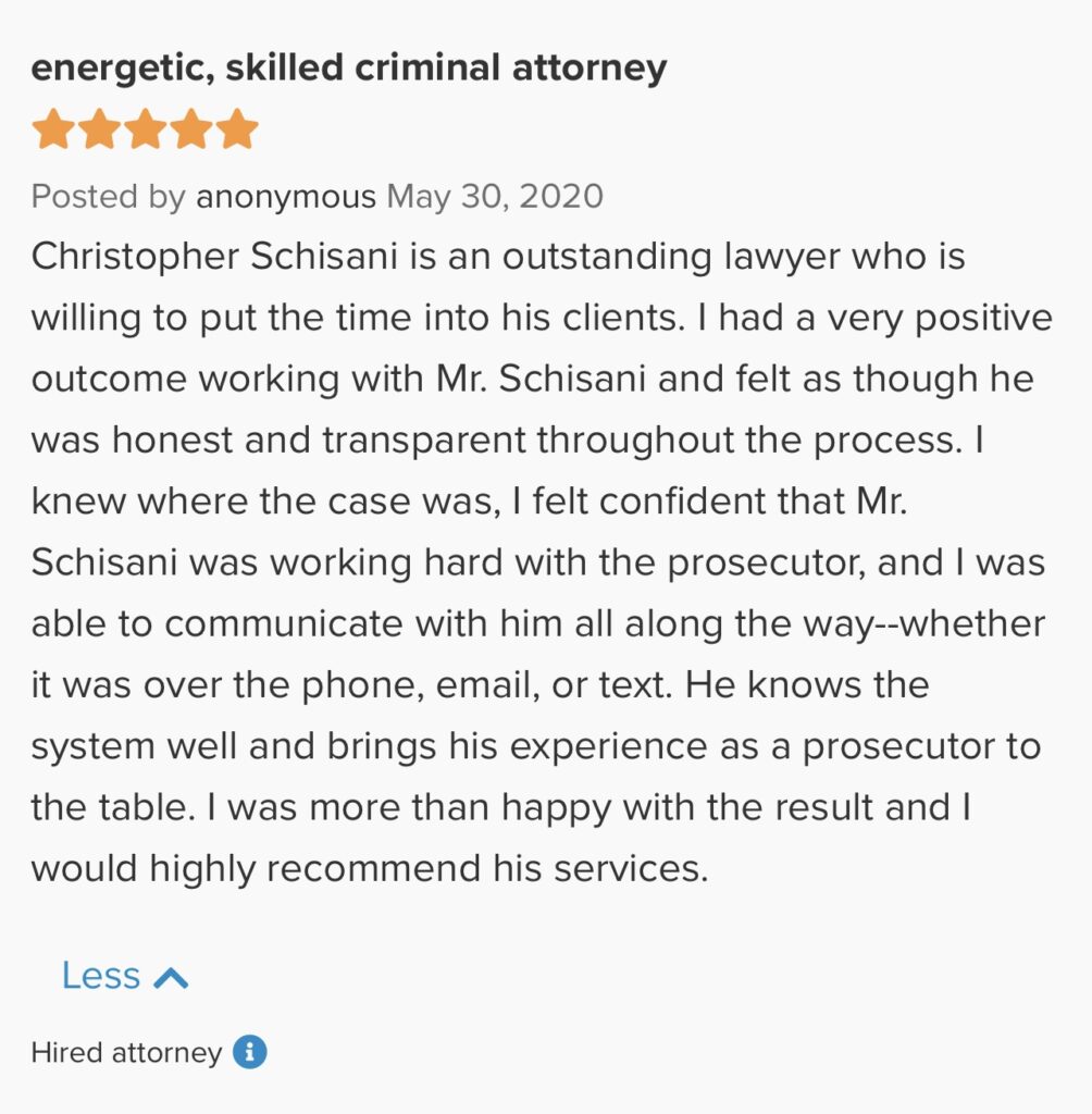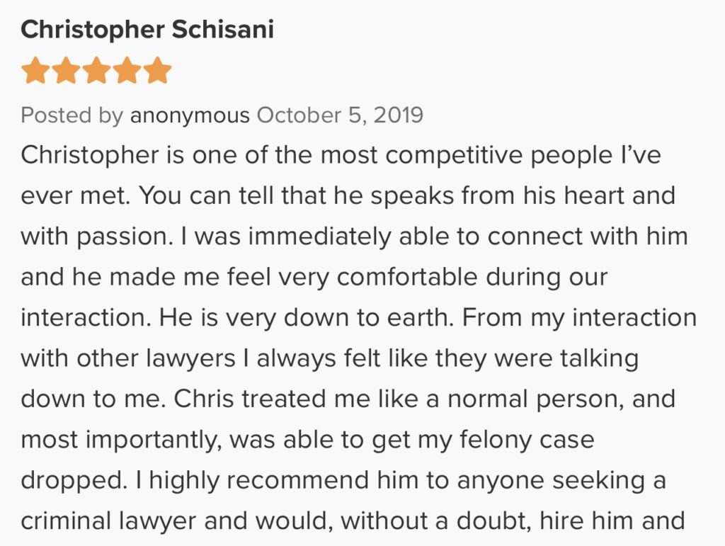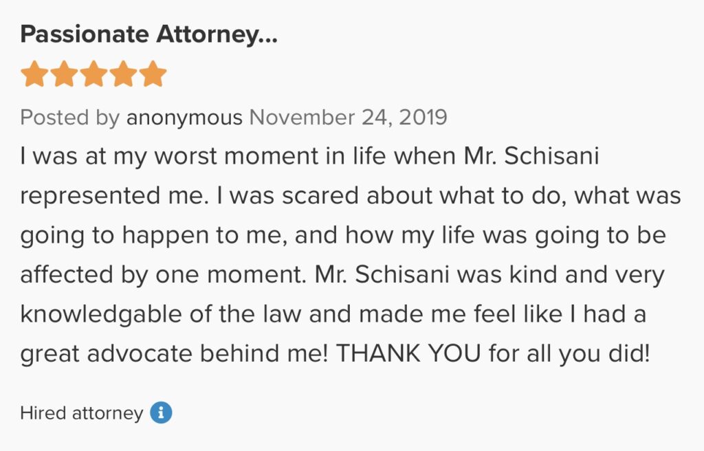 I was charged with a very serious crime and facing considerable consequences. From the beginning, Mr. Schisani was earnest and clear in setting realistic goals to the outcome of the case. As can be expected, the case took some time to resolve, approximately 9 months, and Mr. Schisani did a superb job of providing me with updates throughout the process. When dealing with serious legal allegations, it can be a very stressful time. I was very impressed with his availability and quick response time to all my inquiries regarding the case. Due to Mr. Schisani’s diligence throughout the process, I received a favorable outcome and am very pleased with the results of my case. As a criminal defense attorney, Mr. Schisani was dedicated and tenacious in getting me the best possible outcome. In my opinion, Mr. Schisani provided 5 out 5 legal representation at an exceptional value. I would highly recommend Mr. Schisani’s services to anyone in need of a criminal defense attorney.